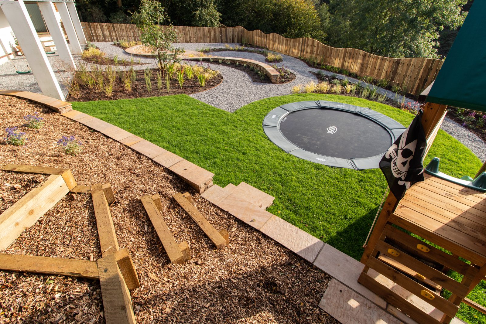 A gently curving path leads you on a journey through the garden, guiding you past layered planting and down towards the lawn and discreet sunken trampoline. The dry stone walls do more than shape the garden — they double as informal seating, creating places to pause, sit and enjoy the surroundings.