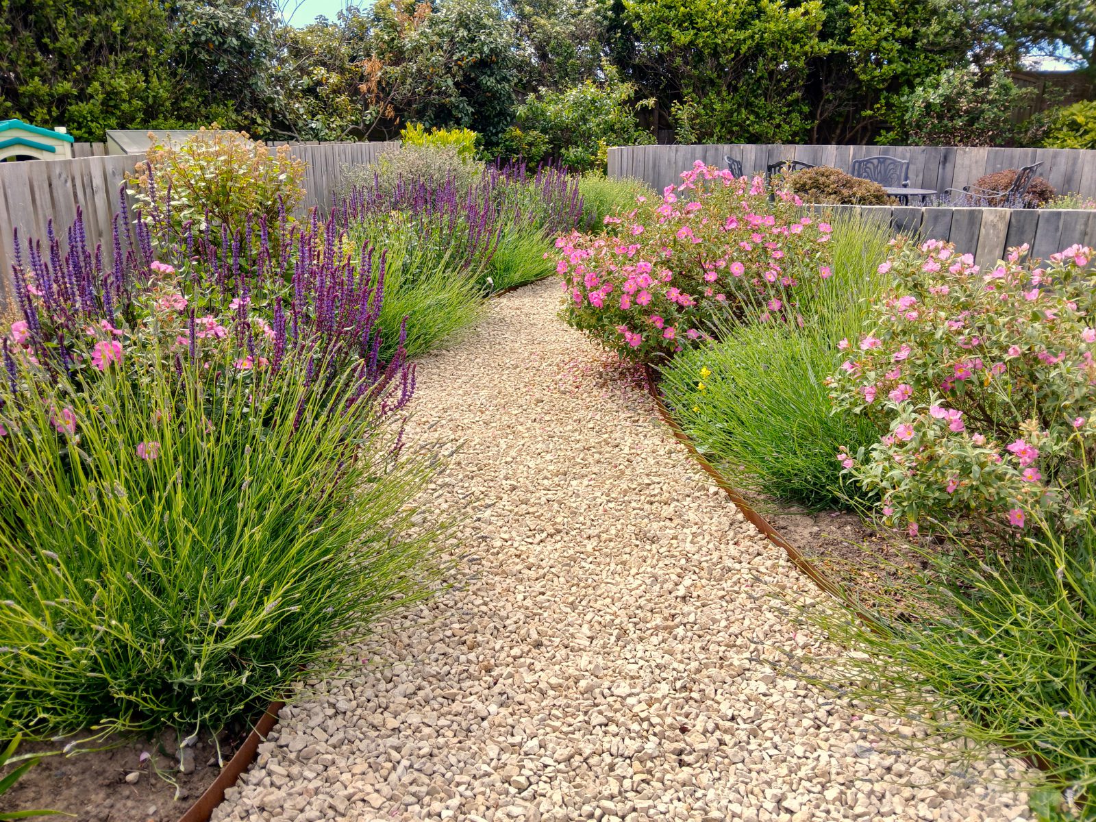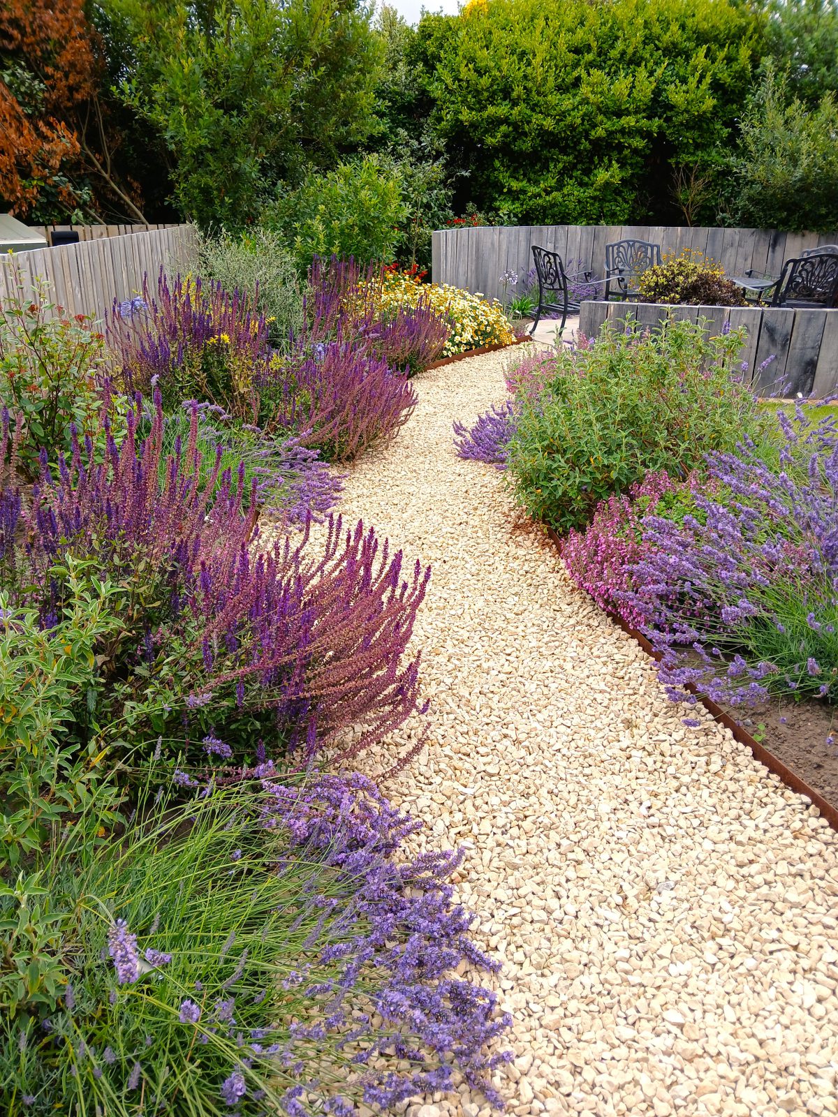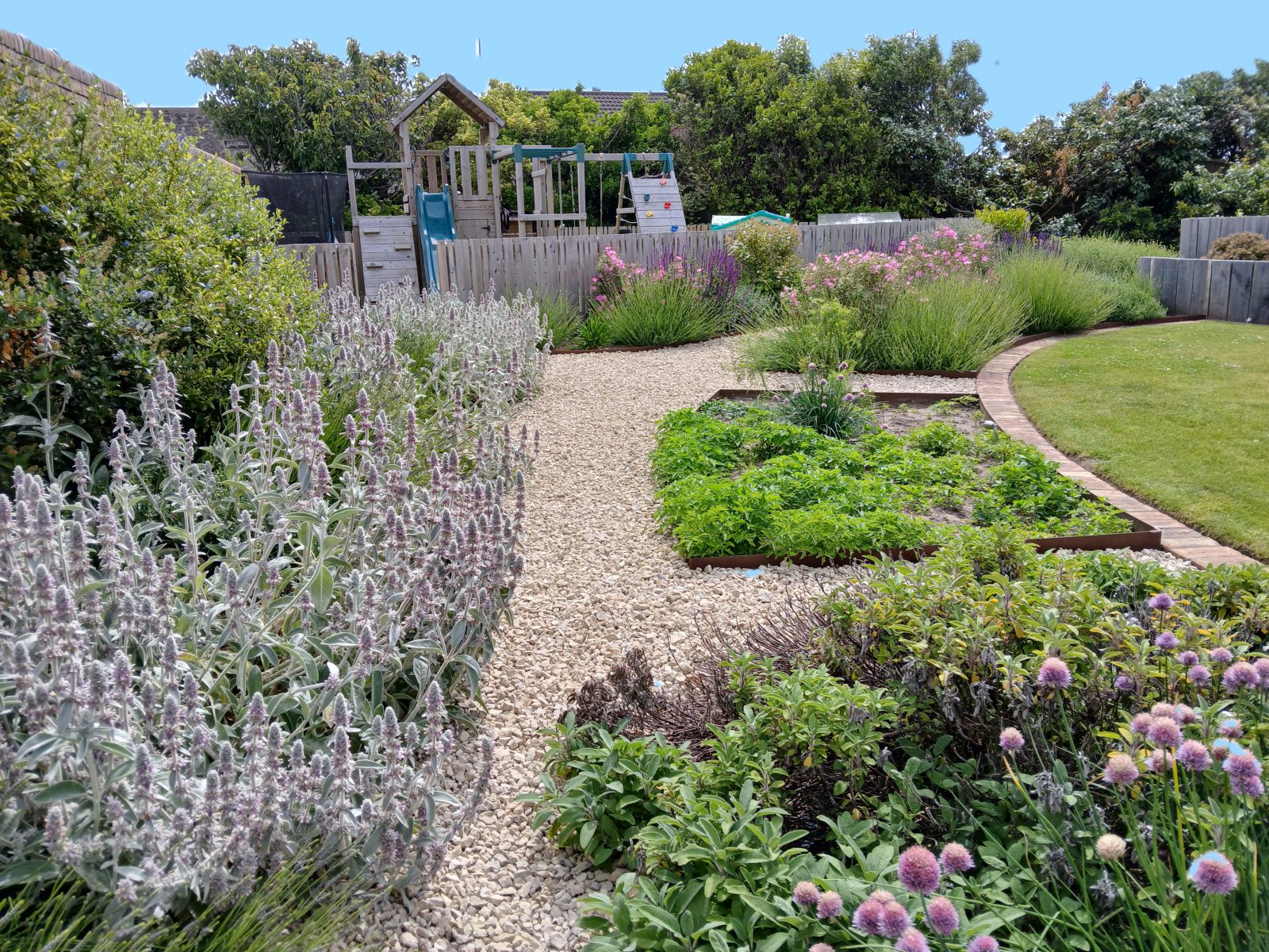 Perennial borders edged in mild steel define the curves, planted with a robust, informal mix that brings colour, texture and seasonal change. Productive herb beds sit comfortably within the layout, encouraging everyday use.