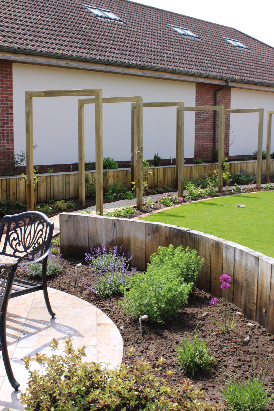 This large oval family garden is designed to feel relaxed, practical and rooted in its setting. A clear structure of flowing paths and porcelain paving connects the house to the wider garden, while timber archways add warmth and gentle moments of transition.
